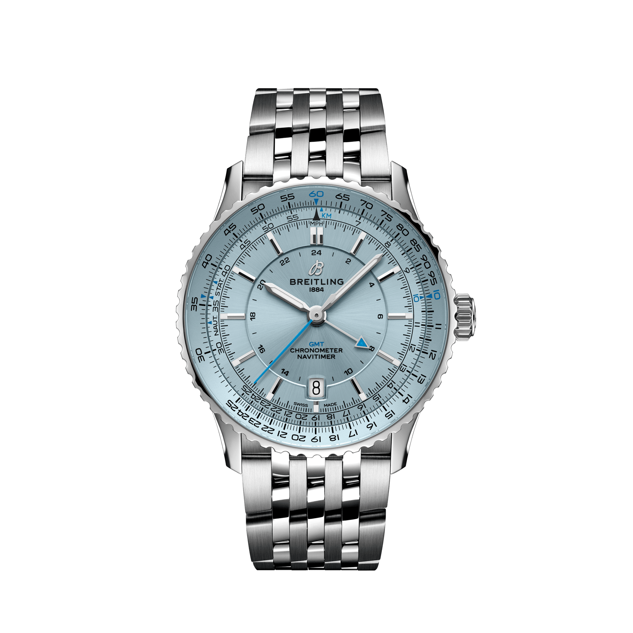 Breitling’s most versatile Navitimer—for the journey. The Navitimer is one of the most recognizable watches ever made. It’s on collectors’ lists of the greatest watches of all time. What began in 1952 as a tool for pilots has gone on to mean something profound to every single person who has had this timepiece along on their personal journey. The Navitimer Automatic and Automatic GMT 41 distill the iconic look, omitting the chronograph yet preserving a balanced dial composition. The central placement of the 24-hour scale on the GMT and the Automatic’s clean face, ensure the intricate slide rule stands out while streamlining the overall aesthetics. Further refining the collection, the notched bezel was incorporated for a contemporary touch, and alternating polished and brushed finishes add a dynamic play of light. Straps in alligator leather and bracelets with a seamless butterfly clasp offer comfort and convenience. The palette includes colorful dials, encased in a choice of stainless steel or 18 k red gold. This reinvention of the Navitimer, marrying the classic with the contemporary, is tailored for enthusiasts and the style-conscious alike, promising Breitling’s commitment to heritage and innovation in each timepiece.
