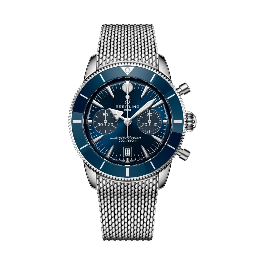 Made to move between the waves and the waterfront. The Superocean Heritage is no ordinary sea watch—it never was. When Breitling first launched it in 1957, it took a different tack from other dive watches of the era. The Ref. 1004 (a sleek time-only piece) and Ref. 807 (the world’s first dedicated dive chronograph) weren’t just about exploring the underwater world—they were about looking good doing it. The spear-and-arrow hands, ceramic rotating bezel, and naturally sleek proportions made it a favorite of stylish adventurers who lived for the sea and the scene. Today, that philosophy is still at the core of the Superocean Heritage. It’s got the soul of the 1950s, but designed for today. The latest Superocean Heritage builds on everything that made the original distinctive—and sharpens it. The chronograph is powered by the Breitling Manufacture Caliber 01, Breitling’s industry-leading timekeeping movement. A ceramic-inlayed bezel adds exceptional scratch resistance, while integrated mesh-metal or mesh-rubber bracelets fit snugly against the case, secured with folding clasps for a clean, watertight finish. Tone-on-tone subdials, a discreet date window at six o’clock, and the original signature hands—arrow for hours, spear for minutes—ensure legibility and balance, above or below the surface.