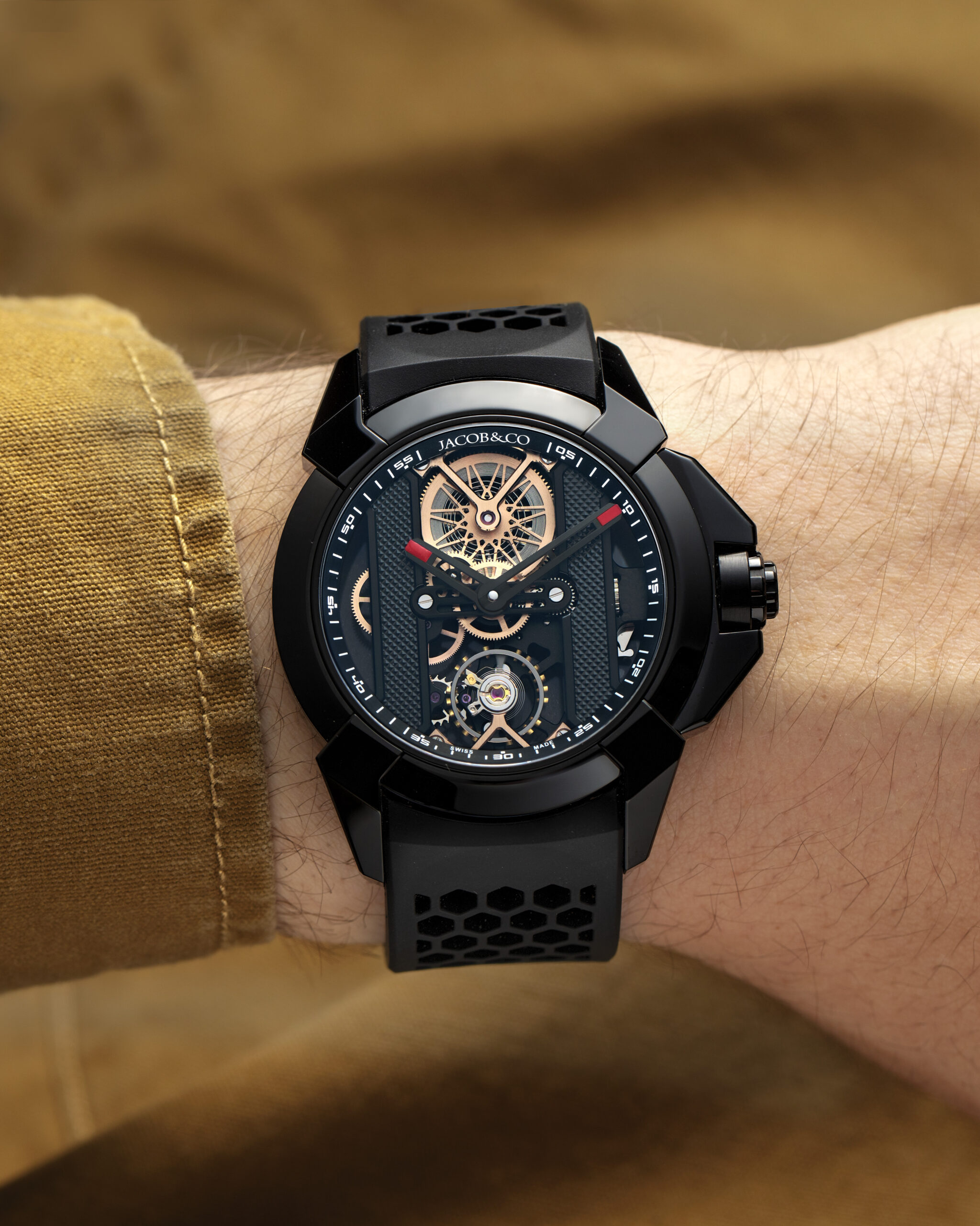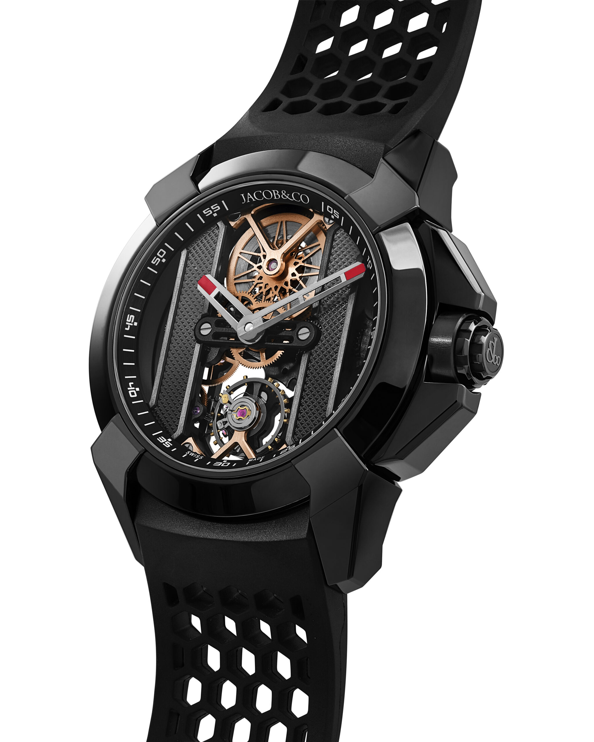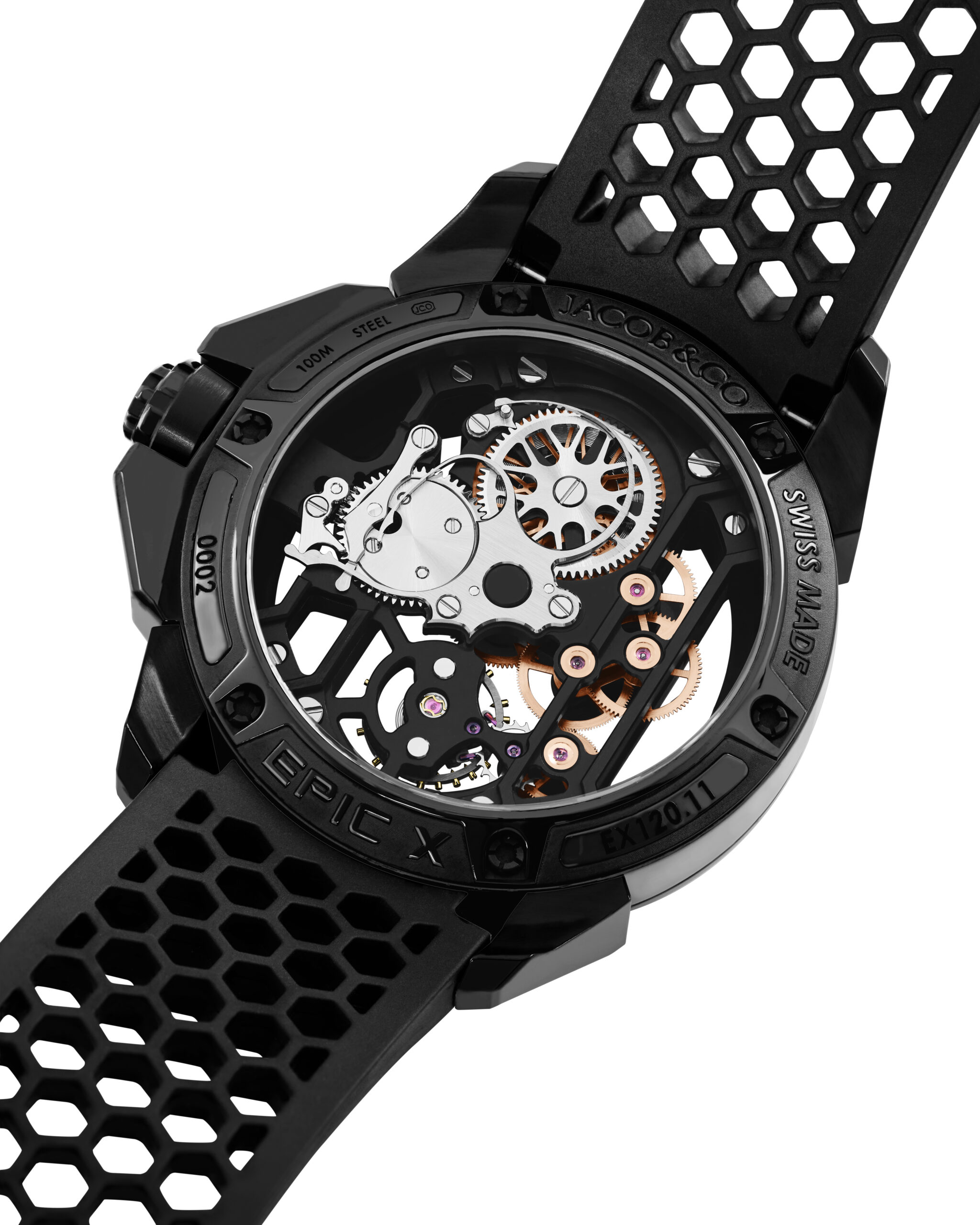 When launching the new Epic X collection in 2016, Jacob & Co. ventured into a new direction, with new shapes, new material and a new frame of mind. The inspiration of the design came from the letter X which symbolizes something unknown, mysterious and appealing which was the energy of the brand at the time. Epic X Bridges is a sleek and sophisticated evolution of that original design. Epic X Bridges is the combination of a staple of watchmaking, the skeleton watch, and the radical design approach of Jacob & Co. As a result, Epic X Bridges unites the inside and the outside, the movement and the 44-mm case. Epic X Bridges’ bezel is smooth and polished, with a steeper angle. The X-shaped lugs are full and flush. Their tips are angular and vertical. The dial-side bridges present a sophisticated engraved Clou de Paris pattern, whose outline defines each piece’s color theme. Transparency, color, innovation, three of Jacob & Co.’s design guidelines are gathered in Epic X Bridges.