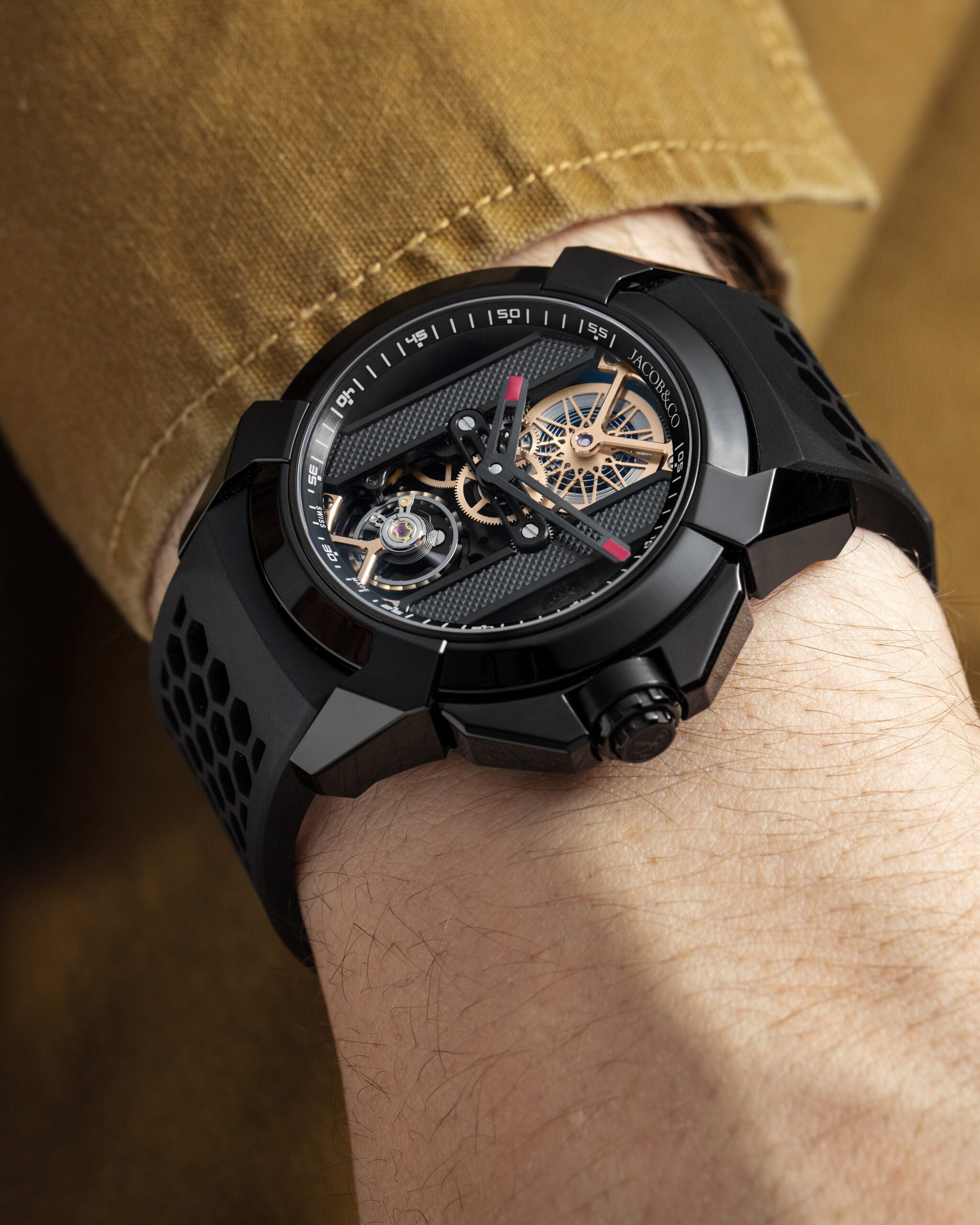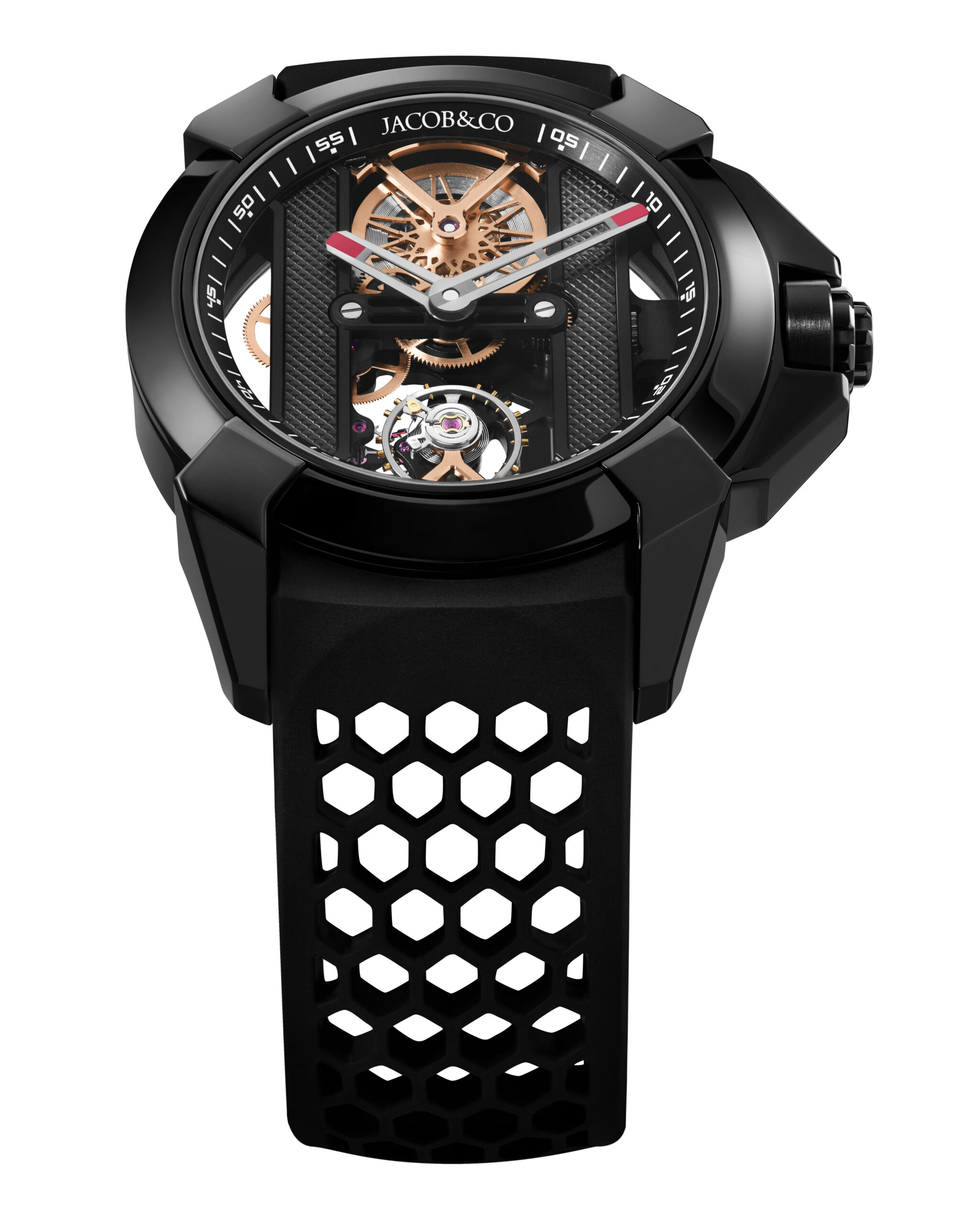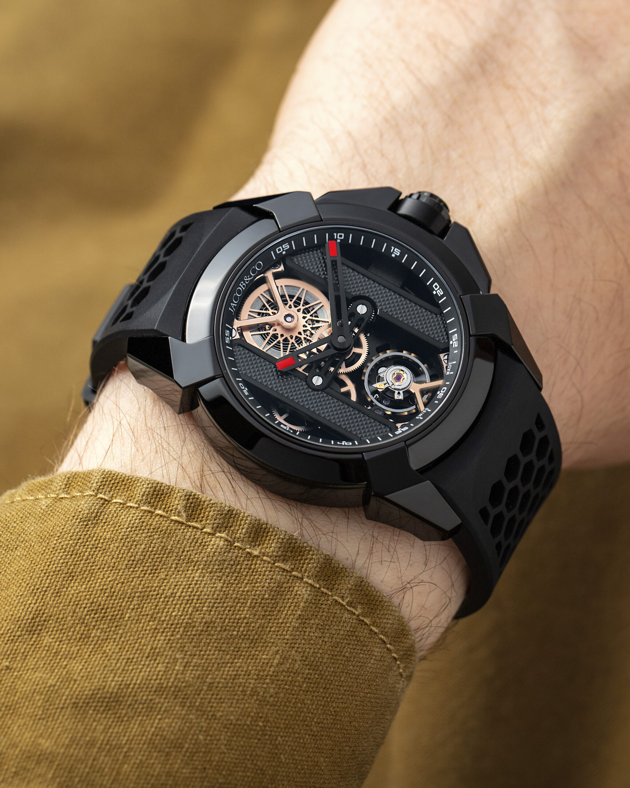 When launching the new Epic X collection in 2016, Jacob & Co. ventured into a new direction, with new shapes, new material and a new frame of mind. The inspiration of the design came from the letter X which symbolizes something unknown, mysterious and appealing which was the energy of the brand at the time. Epic X Bridges is a sleek and sophisticated evolution of that original design. Epic X Bridges is the combination of a staple of watchmaking, the skeleton watch, and the radical design approach of Jacob & Co. As a result, Epic X Bridges unites the inside and the outside, the movement and the 44-mm case. Epic X Bridges’ bezel is smooth and polished, with a steeper angle. The X-shaped lugs are full and flush. Their tips are angular and vertical. The dial-side bridges present a sophisticated engraved Clou de Paris pattern, whose outline defines each piece’s color theme. Transparency, color, innovation, three of Jacob & Co.’s design guidelines are gathered in Epic X Bridges.