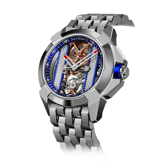 When launching the new Epic X collection in 2016, Jacob & Co. ventured into a new direction, with new shapes, new material and a new frame of mind. The inspiration of the design came from the letter X which symbolizes something unknown, mysterious and appealing which was the energy of the brand at the time. Epic X Bridges is a sleek and sophisticated evolution of that original design. Epic X Bridges is the combination of a staple of watchmaking, the skeleton watch, and the radical design approach of Jacob & Co. As a result, Epic X Bridges unites the inside and the outside, the movement and the 44-mm case. Epic X Bridges’ bezel is smooth and polished, with a steeper angle. The X-shaped lugs are full and flush. Their tips are angular and vertical. The dial-side bridges present a sophisticated engraved Clou de Paris pattern, whose outline defines each piece’s color theme. Transparency, color, innovation, three of Jacob & Co.’s design guidelines are gathered in Epic X Bridges.