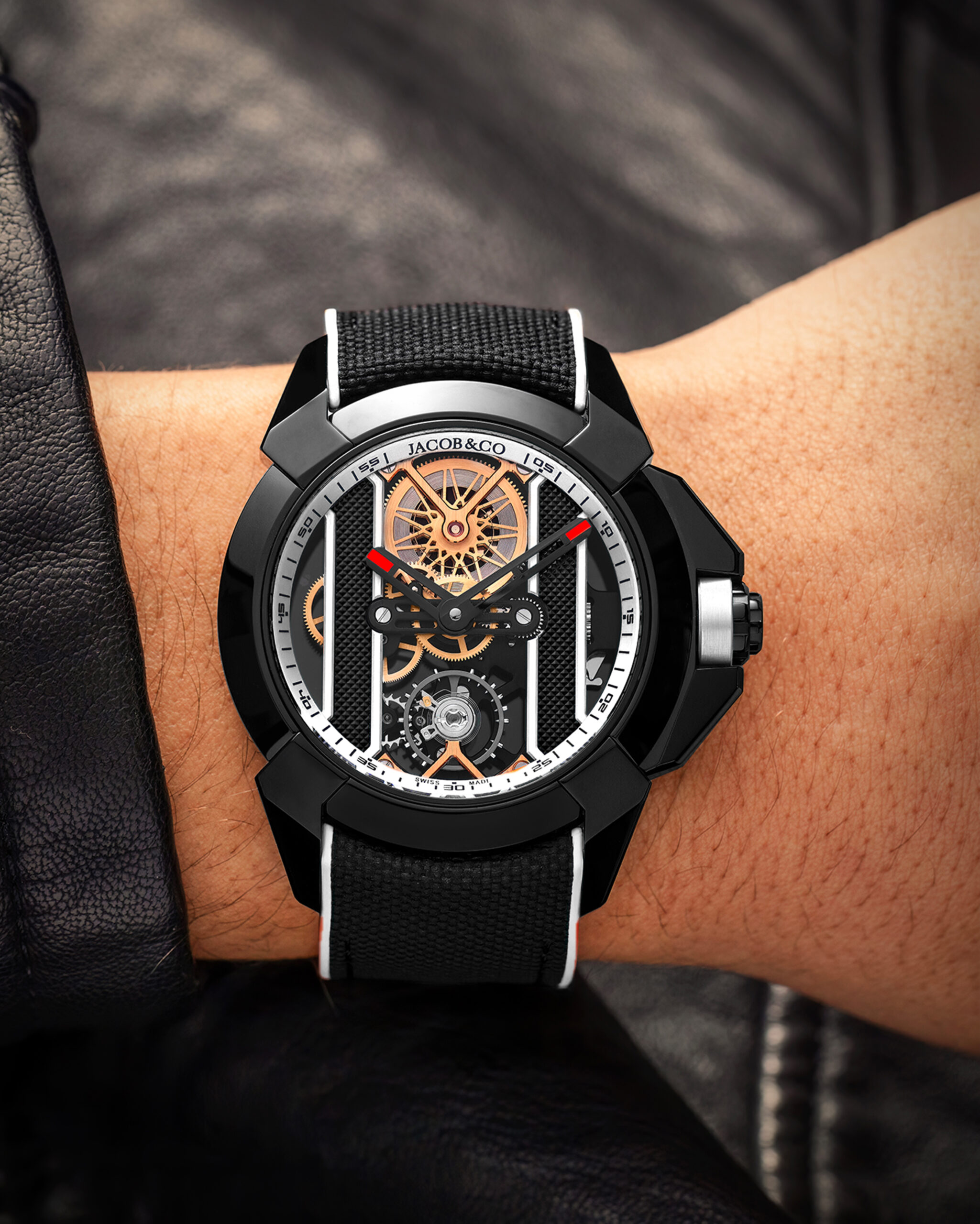 When launching the new Epic X collection in 2016, Jacob & Co. ventured into a new direction, with new shapes, new material and a new frame of mind. The inspiration of the design came from the letter X which symbolizes something unknown, mysterious and appealing which was the energy of the brand at the time. Epic X Bridges is a sleek and sophisticated evolution of that original design. Epic X Bridges is the combination of a staple of watchmaking, the skeleton watch, and the radical design approach of Jacob & Co. As a result, Epic X Bridges unites the inside and the outside, the movement and the 44-mm case. Epic X Bridges’ bezel is smooth and polished, with a steeper angle. The X-shaped lugs are full and flush. Their tips are angular and vertical. The dial-side bridges present a sophisticated engraved Clou de Paris pattern, whose outline defines each piece’s color theme. Transparency, color, innovation, three of Jacob & Co.’s design guidelines are gathered in Epic X Bridges.