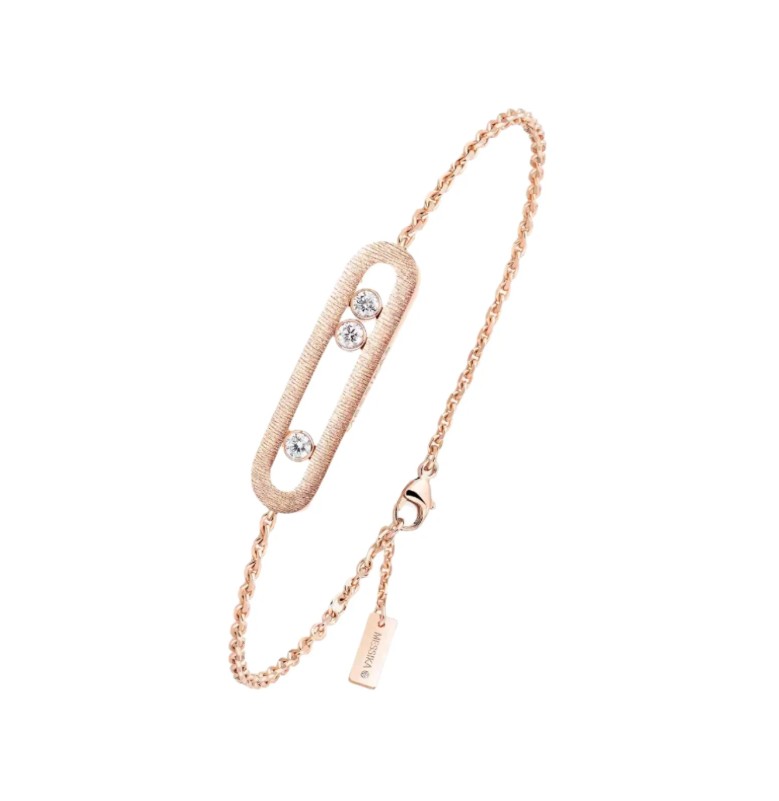 With this chiseled rose gold version of the luxury Move bracelet, Valérie Messika opens a new dialogue between textured gold and her iconic moving diamonds. The Maison’s signature design takes on a subtly vintage accent. Hand-engraved, these gold streaks bring a unique texture reminiscent of the worlds of couture and fashion: a silk velvet effect that catches and reflects the light to infinity.